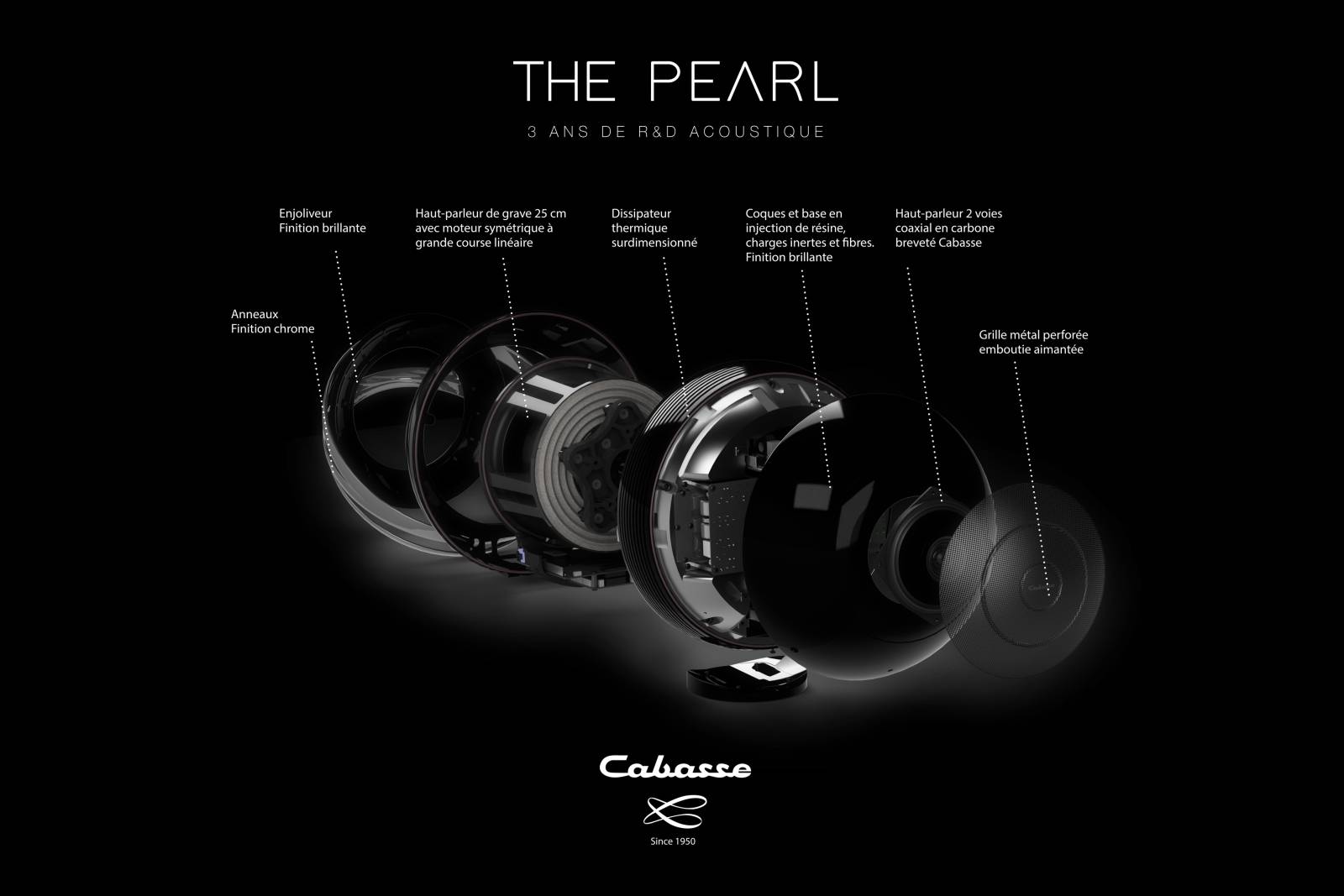 THE PEARL est un véritable ornement du design français, fidèle aux normes de la marque et original, évoquant pureté et force. Equipé des matériaux les plus performants : membranes en fibre de carbone et fibre de verre, dissipateurs et haut-parleurs en aluminium, double coque renforcée avec remplissage en fibre composite, anneau pur "chromium", grille métallique, finition noir métallisé ou blanc nacré.